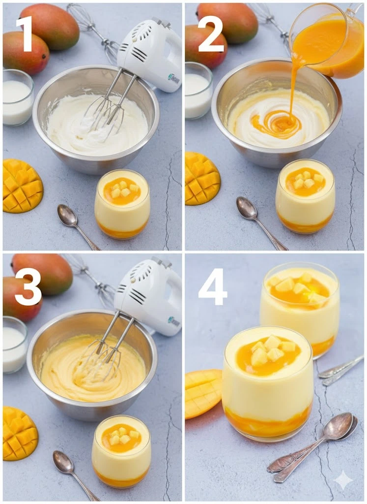 - In a serving glass, put a spoonful of mango pulp at the bottom, followed by the prepared mousse mixture.
