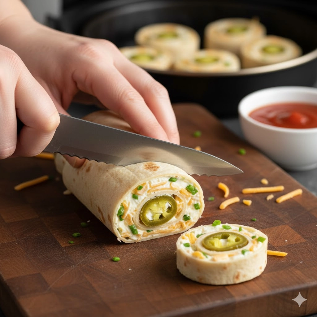 When applying the filling, use an offset spatula or the back of a large spoon. Leave about a quarter-inch border around the perimeter. As you roll the tortilla, keep the tension firm. A loose roll will fall apart in the air fryer as the cheese melts and expands. Once rolled, use a very sharp serrated knife to slice the pinwheels. Avoid pressing down too hard, which can flatten the spiral; instead, use a gentle sawing motion.