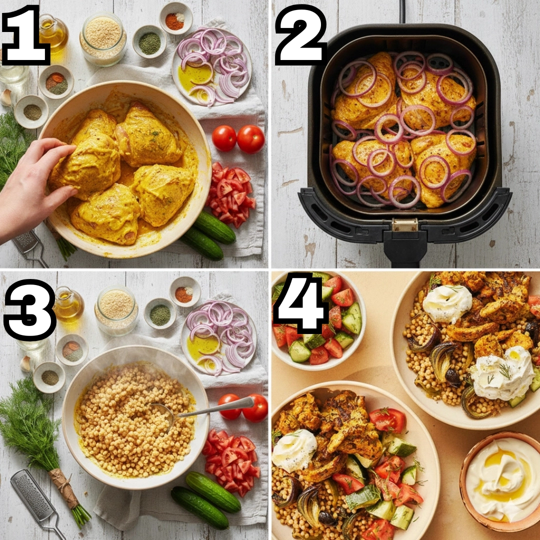 - Once the chicken is golden and the onions are tender, assemble the bowls. Start by fluffing the cooked couscous and mixing it with the roasted red onions, 1 tablespoon of olive oil, and a final seasoning of salt and pepper. Divide the onion-infused couscous and the fresh tomato-cucumber salad among four bowls. Place the air-fried chicken on top, finishing each portion with a dollop of fresh Greek yogurt and an extra drizzle of olive oil if desired.