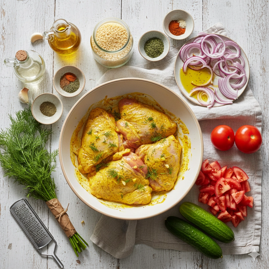The salad component provides the necessary “acid trip” to cut through the richness of the yogurt-marinated meat. By macerating the cucumbers and tomatoes in white wine vinegar and fresh dill, you create a quick pickle effect. The salt draws out just enough juice from the tomatoes to create a light natural dressing that mingles with the olive oil on the plate. Dill is the secret weapon here; its feathery leaves provide a bright, citrusy punch that lifts the entire flavor profile of the bowl, distinguishing it from a standard garden salad.