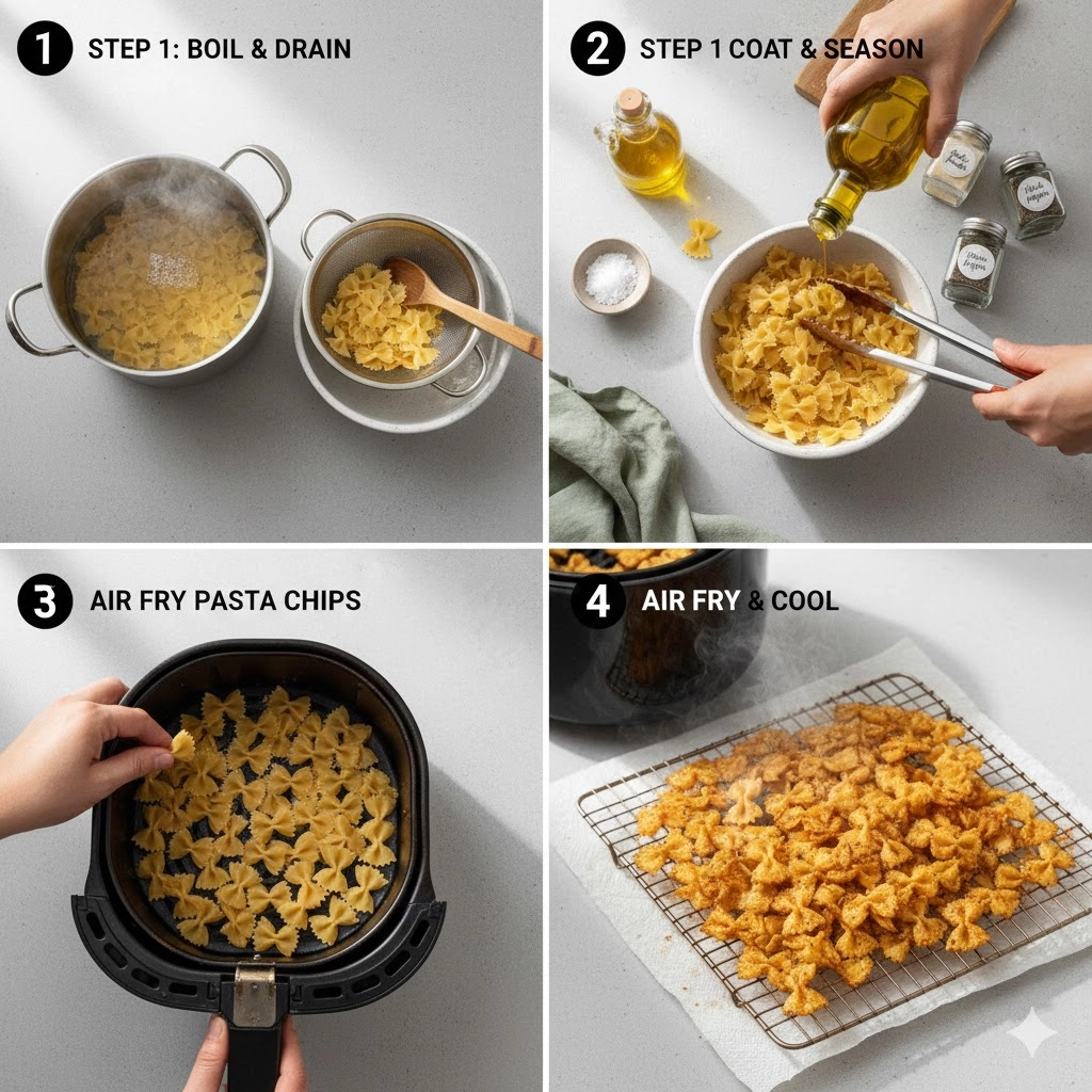 Loading Technique (The Critical Step): The success of this recipe hinges entirely on arranging the pasta in a single, non-overlapping layer. Any pieces that touch or stack will steam each other, remaining soft and refusing to crisp. For standard four- to six-quart air fryers, you will need to process the recipe in at least three to four separate batches. Patience here is rewarded with maximum crunch.