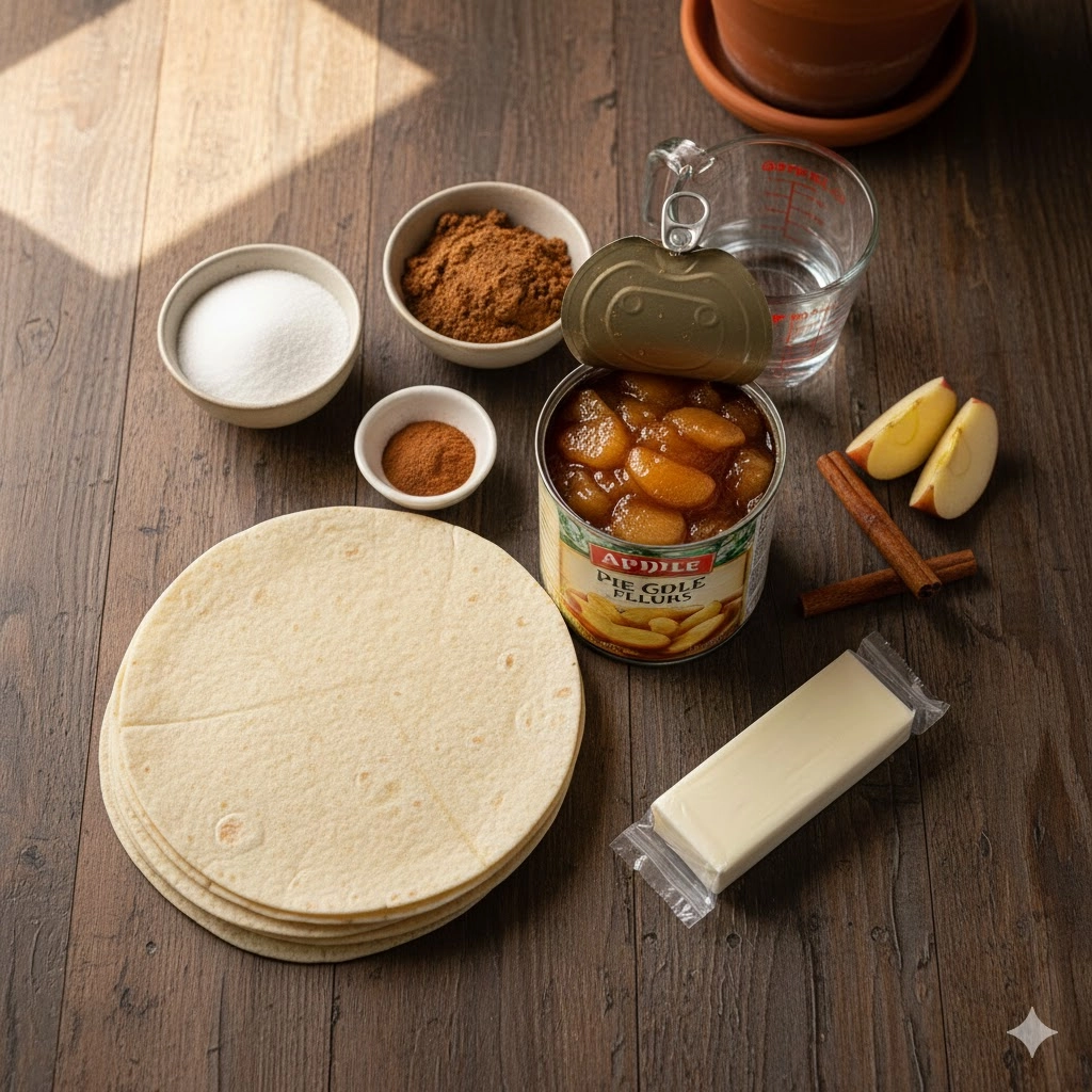 - Lay the flour tortillas flat. Spoon the apple pie filling evenly down the center of each tortilla.