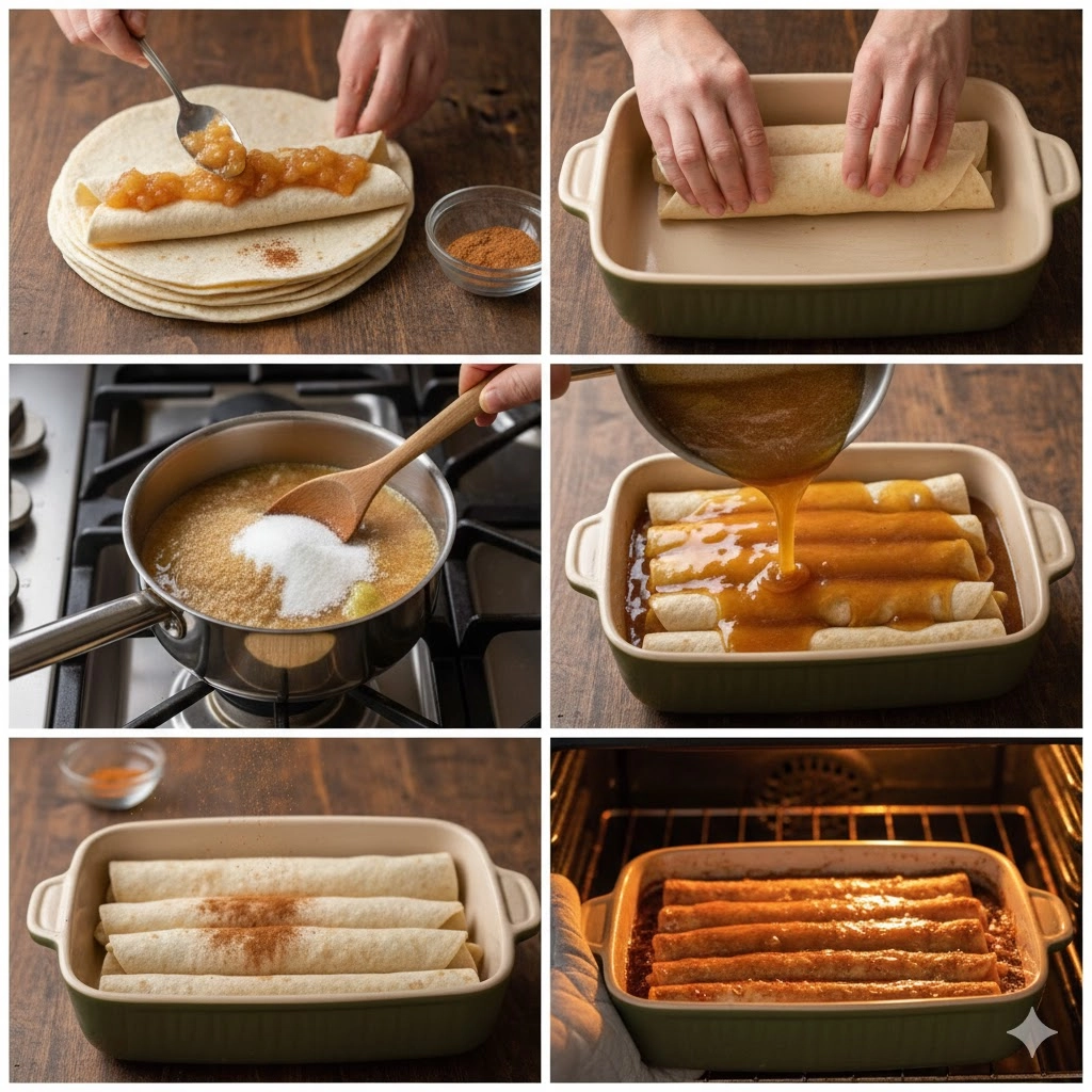 The sugar syrup is the soul of this Apple Enchilada Dessert. When boiling the white sugar, brown sugar, and water, ensure the margarine is fully emulsified. The three-minute simmer is non-negotiable; it allows the water to evaporate slightly, concentrating the sugars into a true syrup. You are looking for a glossy, translucent appearance. When pouring this over the tortillas, aim for total coverage. Any exposed flour surface that isn’t touched by the liquid may become tough during the baking process.