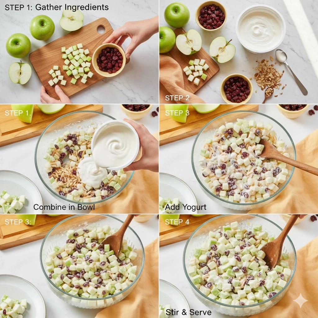 - In a large salad bowl, combine the chopped tart green apples, toasted slivered almonds, dried cranberries, and chopped dried cherries.
