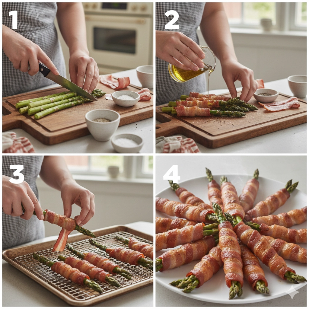 Yes, this is an excellent strategy for hosting. You can trim the asparagus, season them, and wrap them in the bacon strips up to 24 hours in advance. Store them on a tray covered tightly with plastic wrap in the refrigerator. When your guests arrive, simply move them to the wire rack and pop them in the oven. This ensures they are served piping hot and at their maximum crispiness.