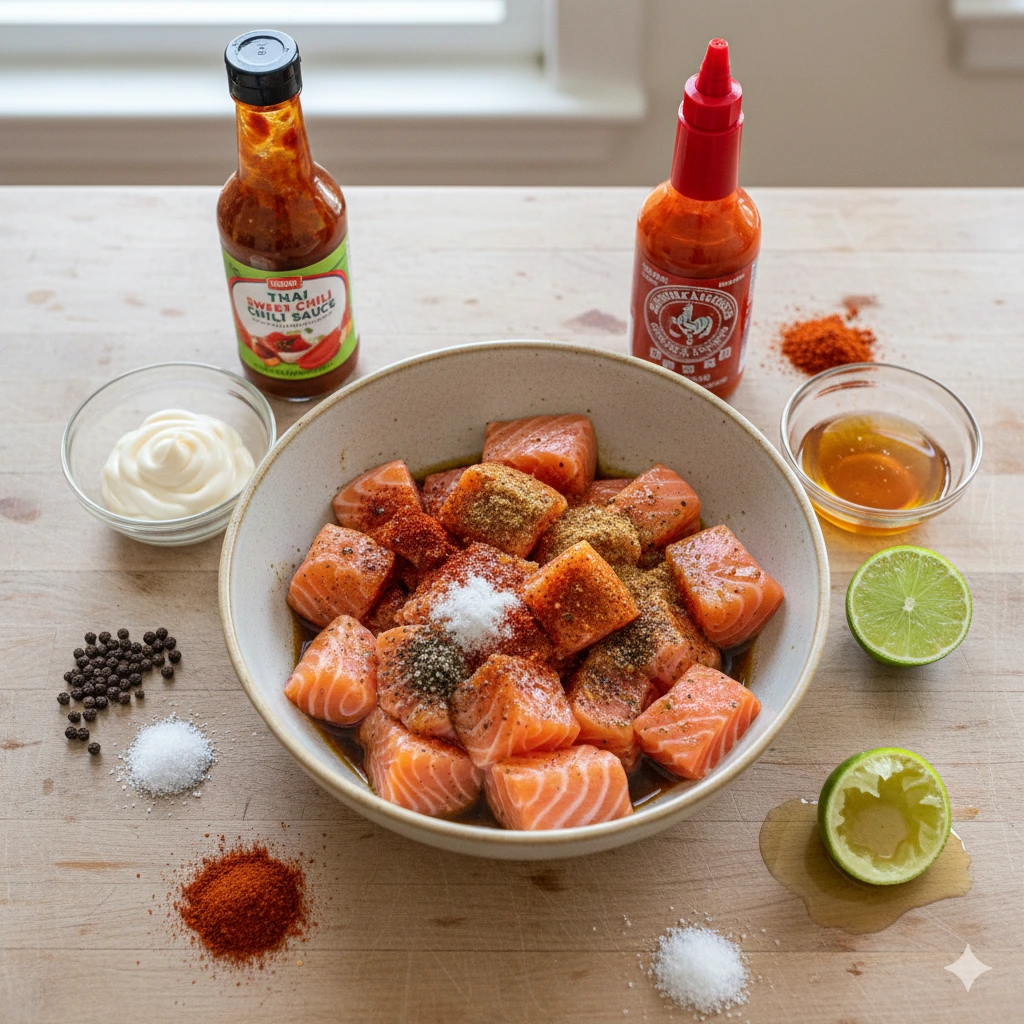 To achieve the perfect balance of heat and sweetness, ensure your ingredients are fresh and measured accurately. This recipe is divided into two parts: the seasoned salmon base and the creamy signature glaze.