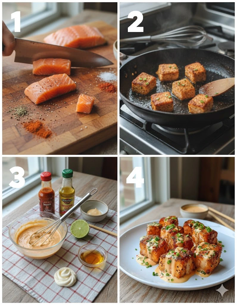 - Heat a non-stick skillet over medium-high heat. Add the salmon cubes and cook for 2–3 minutes on each side until a golden brown crust forms.