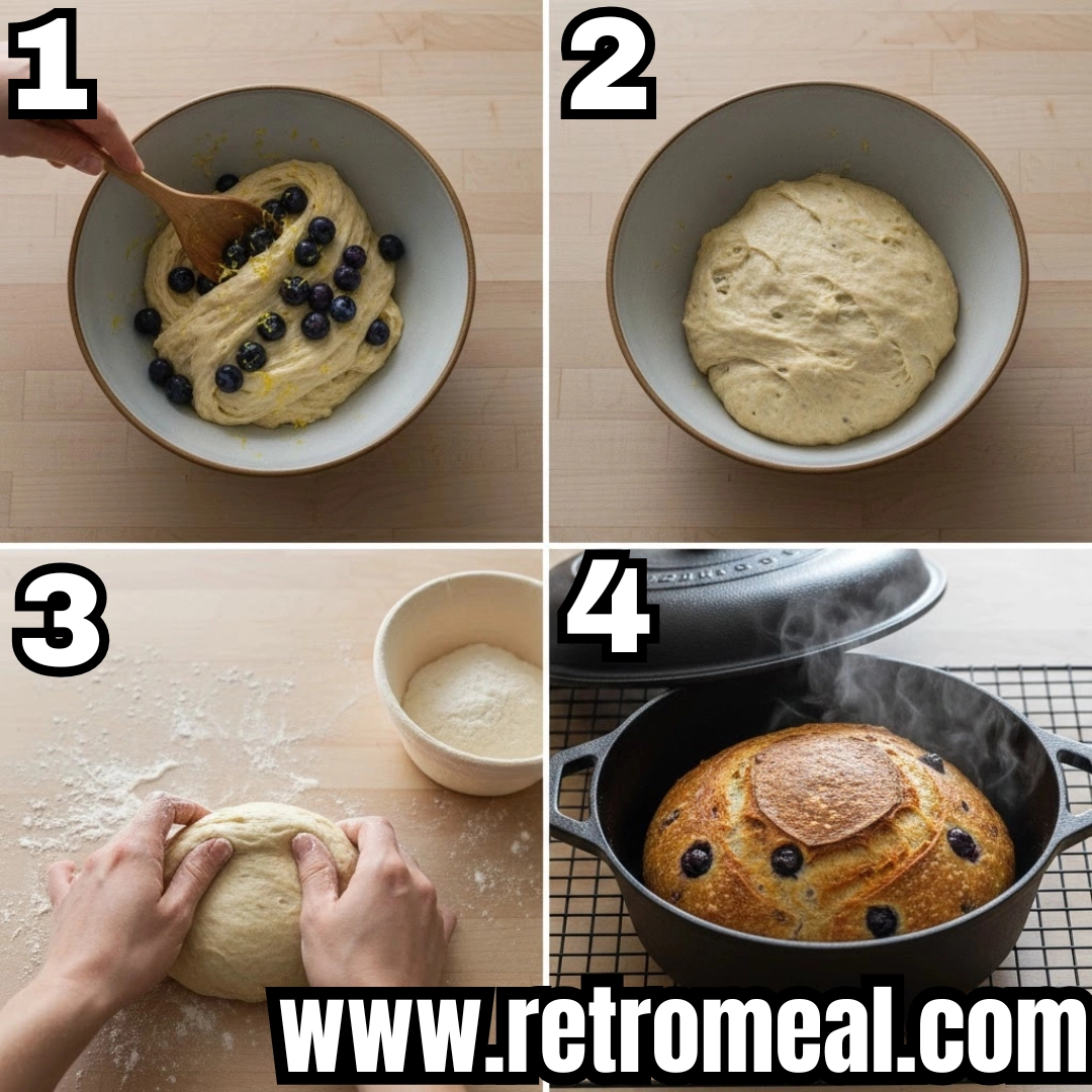 - Perform 4 sets of stretch and folds every 30 minutes. Add blueberries during the second set, folding gently.