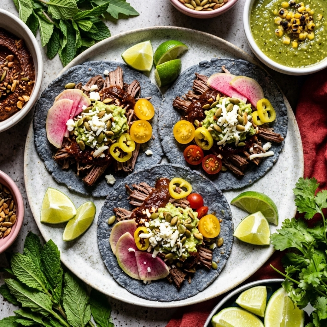 Pickled red onions are another superstar accompaniment. You can make a quick version by soaking sliced onions in lime juice and a pinch of salt while the meat finishes. The bright pink color makes the tacos visually stunning, and the vinegar “cleans” your palate between bites. For the tortillas, always go with corn if possible. To get that authentic street taco feel, heat them in a dry cast-iron skillet until they show small charred spots. This toasted corn aroma is the perfect bridge between the earthy spices of the rub and the savory meat.