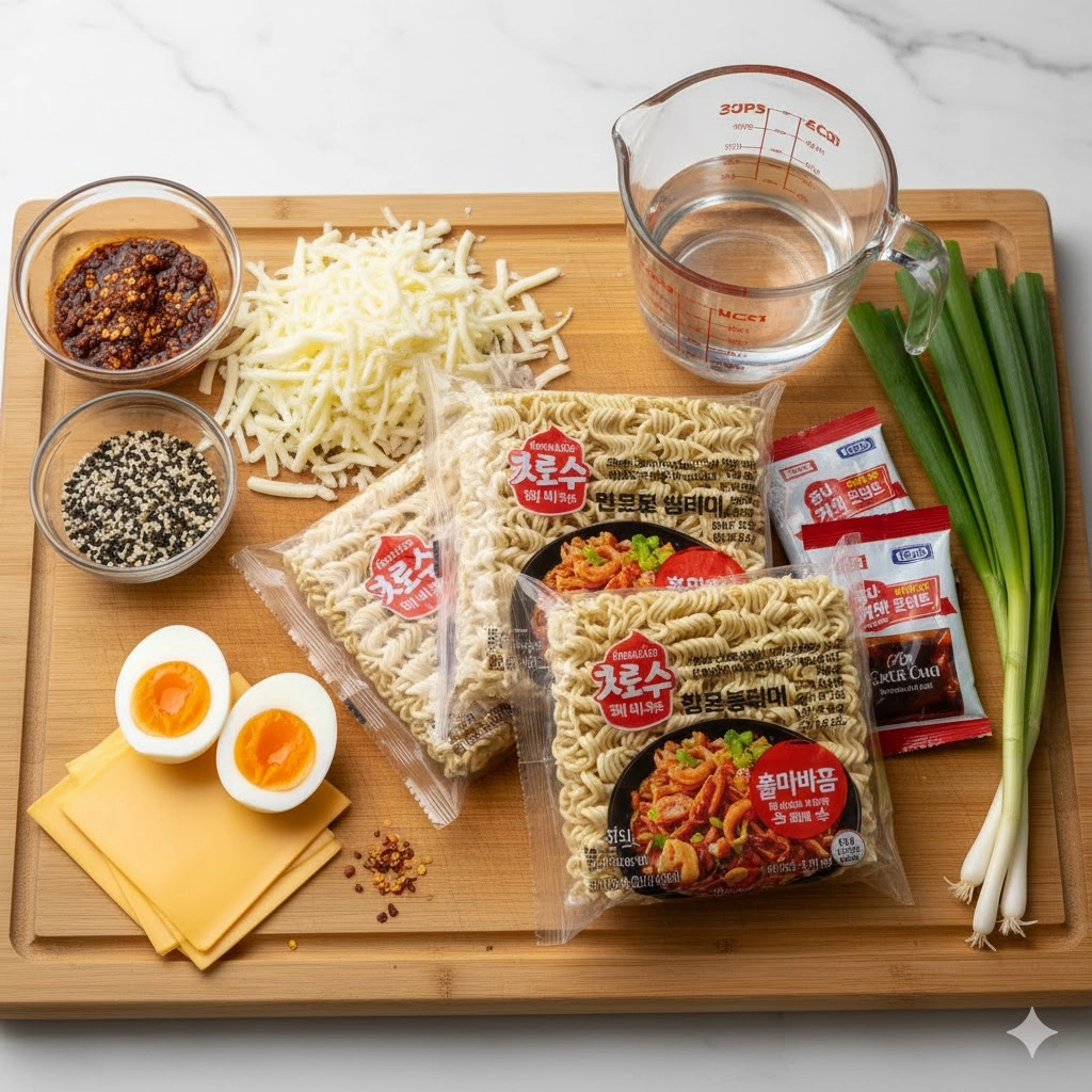 - Three 4.5 ounce packages of spicy Korean ramen (specifically the Buldak variety)