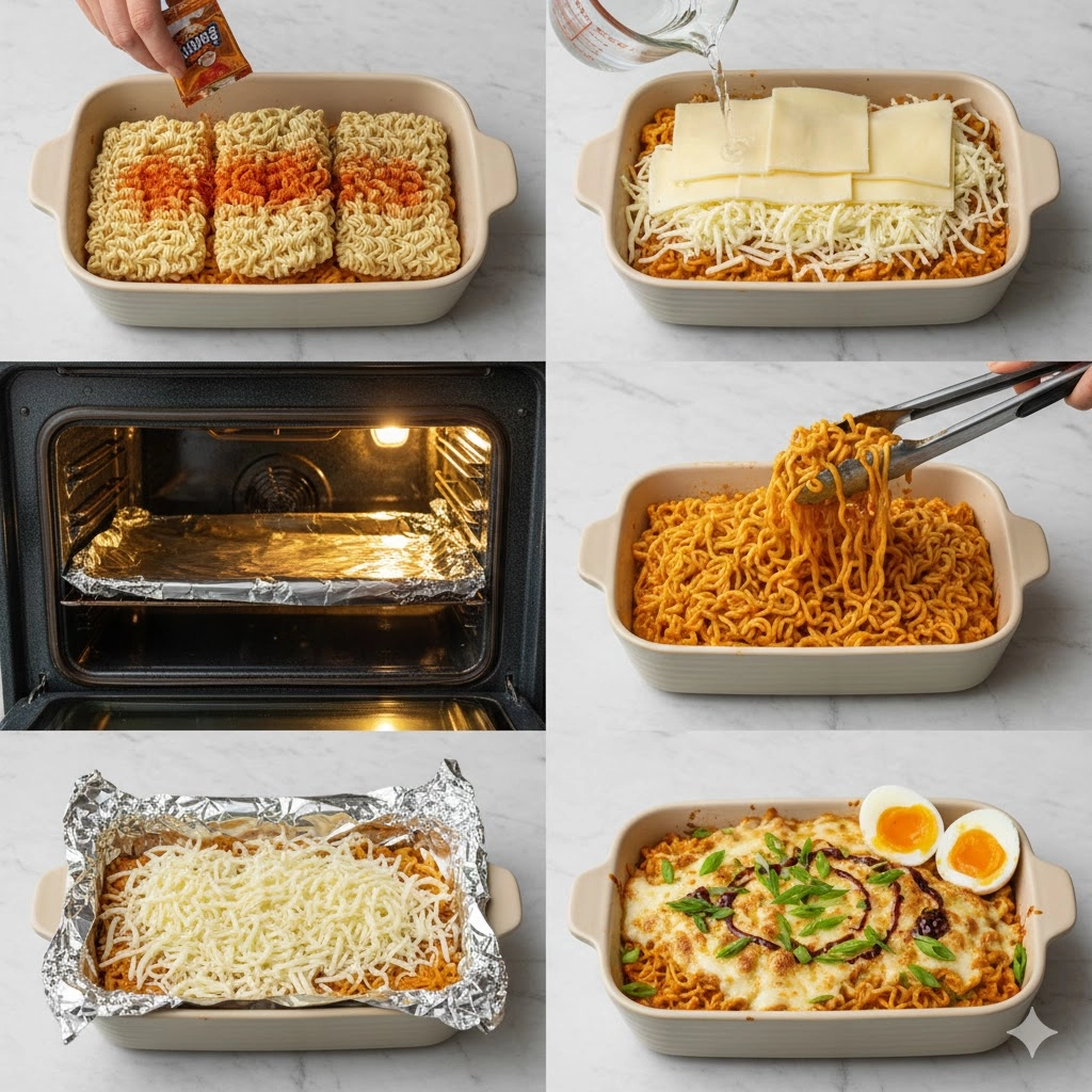 Begin by arranging the ramen bricks in your baking dish so they lay as flat as possible. When adding the seasoning packets, ensure the powder is distributed across the dry noodles rather than dumped in one spot. This ensures that as the water heats up, the spice penetrates every strand. By discarding the liquid sauce packet and using only the dry seasoning, you maintain control over the salt levels and the specific chemical heat profile of the dish.