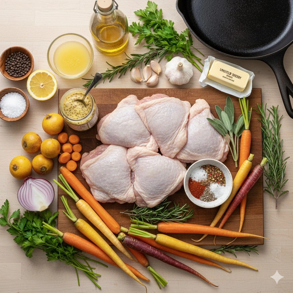 The secret to this dish lies in the transition from the stovetop to the oven. When you sear the chicken thighs initially, you are not just adding color; you are developing the Maillard reaction, which provides the savory foundation for the entire meal. Using bone-in, skin-on thighs is non-negotiable here. The bone acts as an insulator, keeping the meat juicy during the 40-minute roast, while the skin renders its fat into the pan, essentially “confit-ing” the carrots and parsnips in chicken gold.