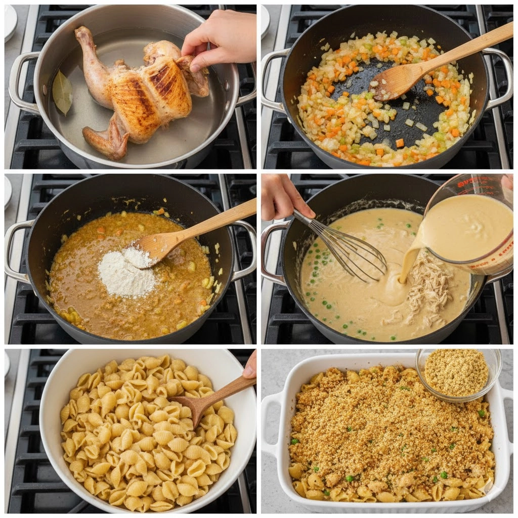Begin by focusing on the foundation of the Chicken Pot Pie Pasta Bake: the stock. Using the bones and skin from a pre-roasted chicken provides a gelatinous body and smoky undertone that store-bought broth lacks. Simmer this gently; a rolling boil will cloud the stock. When you strain it, you should have a rich, amber liquid that smells intensely of roasted poultry.