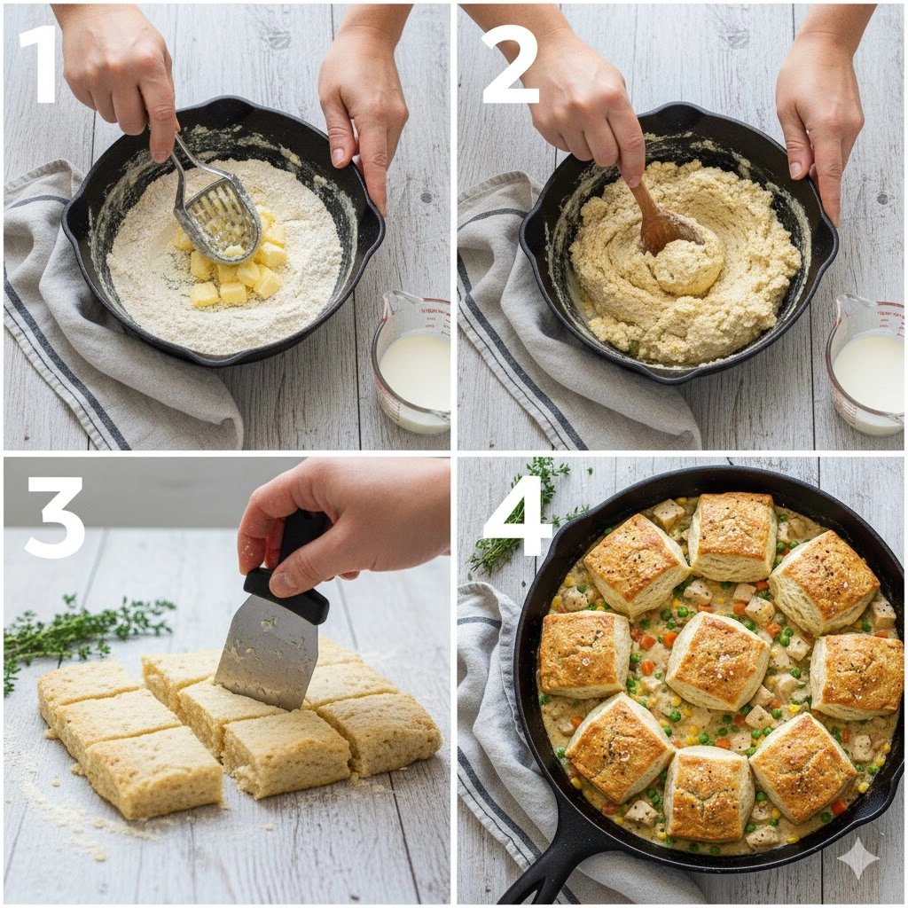 - Preheat oven to 425°F. Whisk biscuit dry ingredients together, work in cold butter until pea-sized, and stir in buttermilk until a shaggy dough forms.