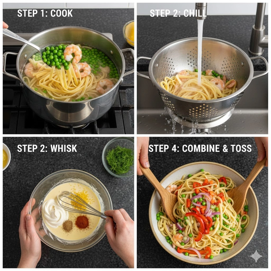 - Introduce the chilled pasta, shrimp, and peas into the bowl containing the dressing.
