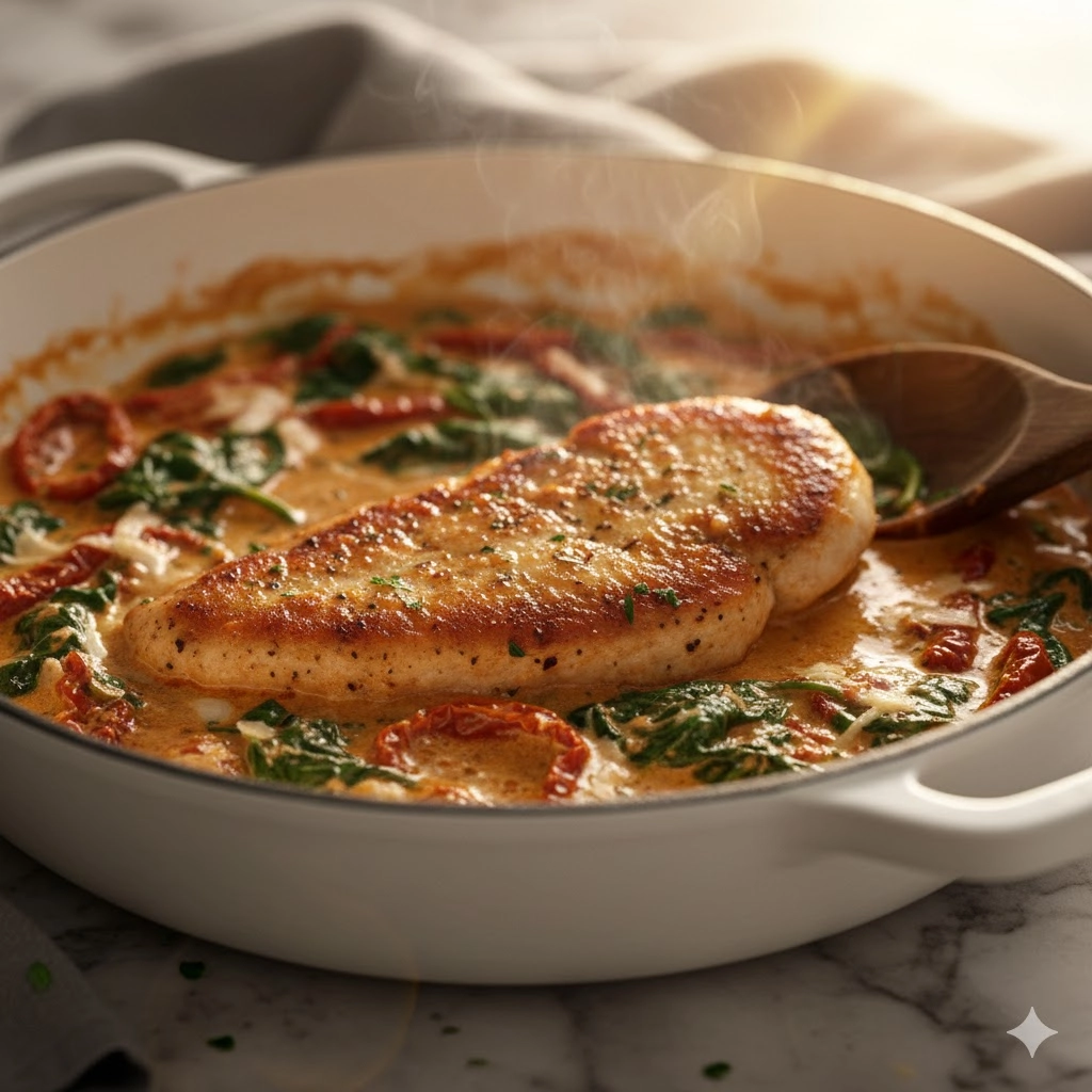 The essence of rustic, comfortable dining is captured perfectly in a single skillet of Creamy Tuscan Chicken. This dish is an inspired blend of rich, succulent pan-seared chicken breast, sun-dried tomatoes bursting with concentrated flavor, and fresh spinach, all bathed in an impossibly lush, savory sauce. It’s the kind of meal that feels luxurious enough for a special occasion yet comes together quickly enough to anchor a satisfying midweek table. What sets this recipe apart is its careful balance—the sweetness of the tomatoes and the slight bitterness of the spinach cut through the richness of the cream base, creating a balanced, vibrant culinary experience that speaks of the Italian countryside.