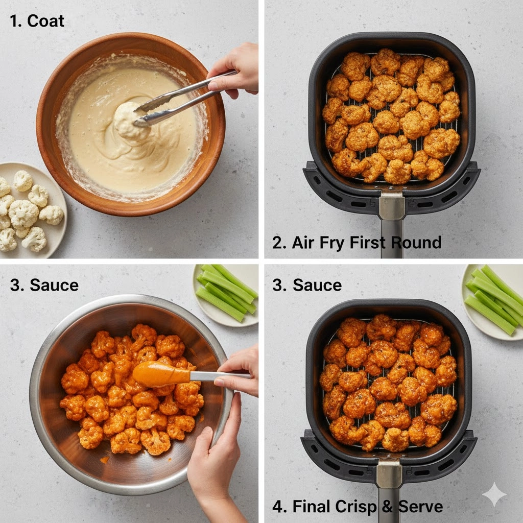 Once you toss the hot, freshly crisped cauliflower with the Buffalo sauce, you introduce moisture back into the system. This is a deliberate step: the sauce adds the signature flavor, but it also softens the crust slightly. This is why the second, shorter air fry is absolutely essential. The initial crust must be robust enough to handle the moisture influx without collapsing entirely. Toss quickly and gently—you want the sauce evenly distributed but you don’t want to break the delicate exterior you just worked so hard to create.