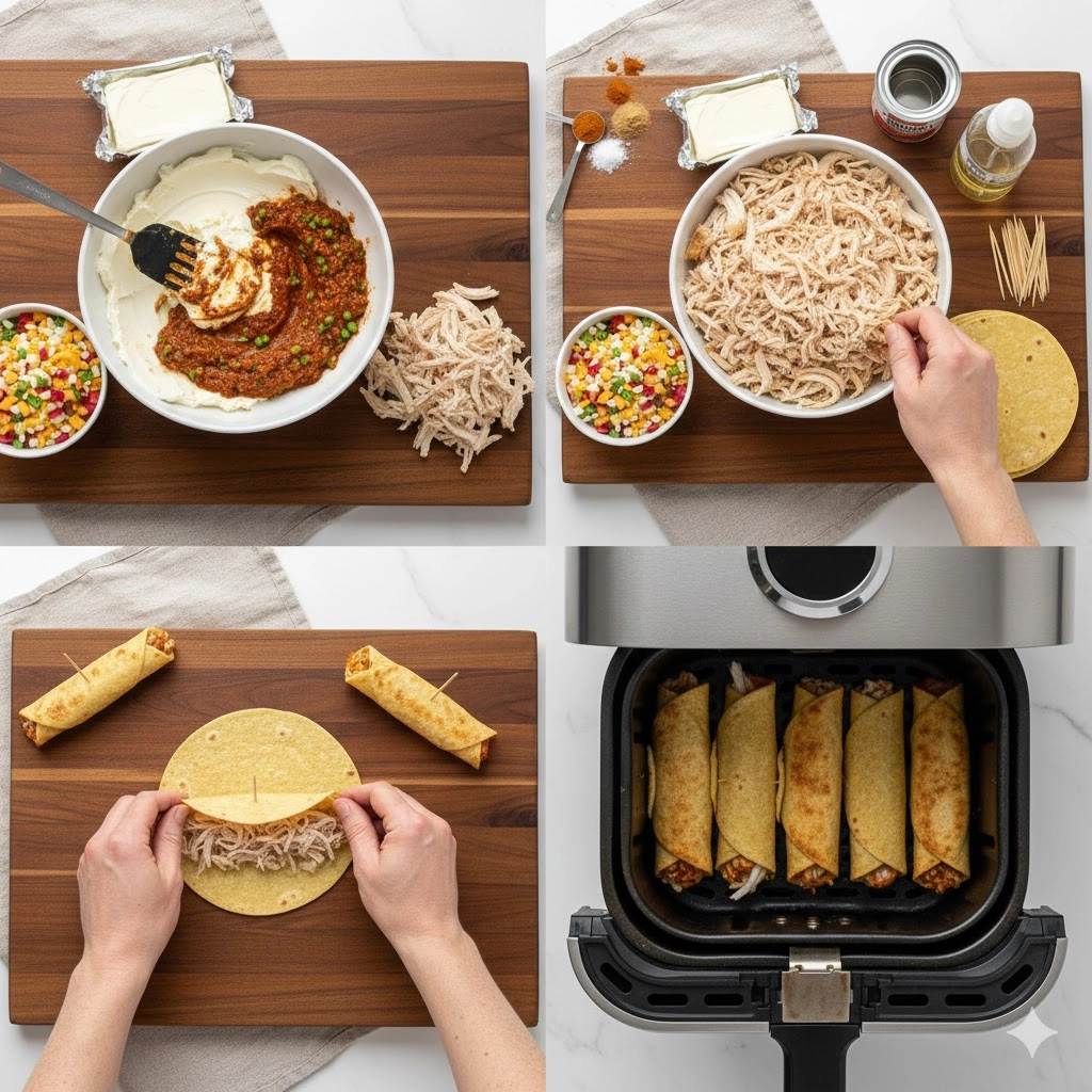 When it comes to the tortillas, corn requires a bit more finesse. They are naturally more brittle, so steaming them under a damp paper towel for thirty seconds is a non-negotiable step. For the assembly, place about three tablespoons of the chicken mixture in a line across the lower third of the tortilla. Roll away from yourself, keeping the tension tight. The toothpick should be inserted through the seam to hold it shut. When placing them in the basket, always put the seam-side down. This double-layer of security ensures they don’t unfurl as the hot air begins to circulate.