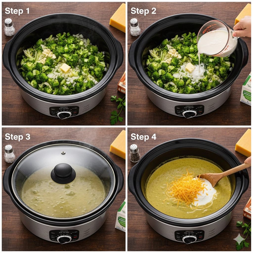 - Begin by preparing your produce. Carefully cut the broccoli into small, uniform bite-sized pieces to ensure even cooking. Place the chopped broccoli, butter, diced onion, diced celery, and minced garlic directly into the basin of your slow cooker. Sprinkle in your salt and pepper at this stage as well.