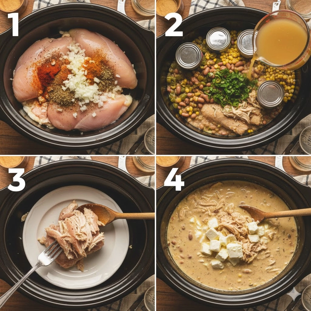 Following these steps ensures that the chicken remains tender and the broth achieves that signature thick consistency that separates a great chili from a standard soup.