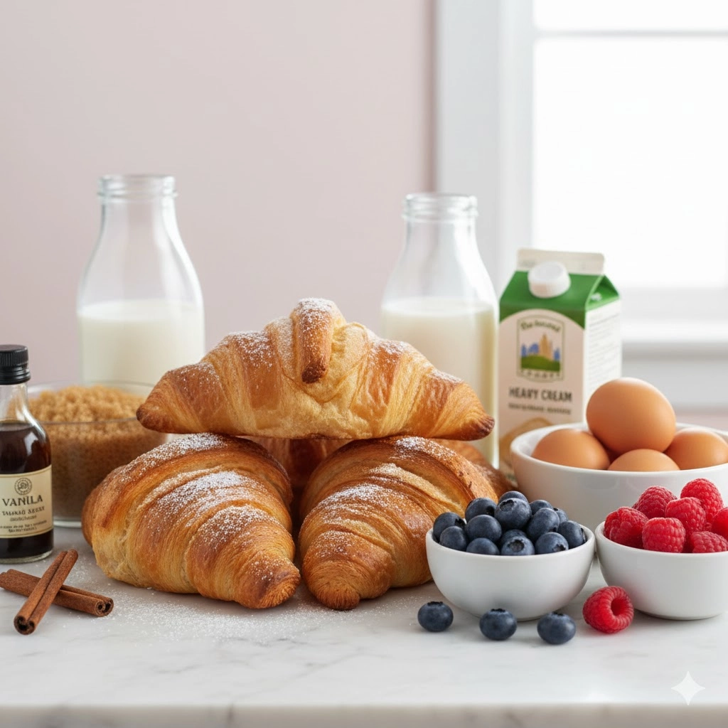 To create this decadent breakfast masterpiece, you will need a handful of pantry staples paired with high-quality bakery items. The key to the richness of this dish lies in the combination of whole eggs and heavy cream, which creates a velvety custard that permeates every layer of the pastry.