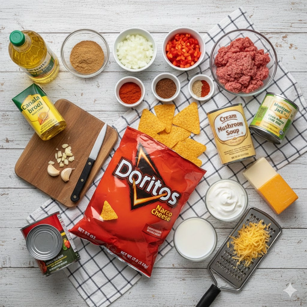 - Preheat your oven to three hundred fifty Fahrenheit. Lightly grease a nine-by-thirteen-inch baking dish. Spread one third of the lightly crushed Doritos across the bottom of the prepared dish. Spoon half of the meat filling evenly over the chips. Sprinkle half of the combined Monterey Jack and Cheddar cheese over the filling.