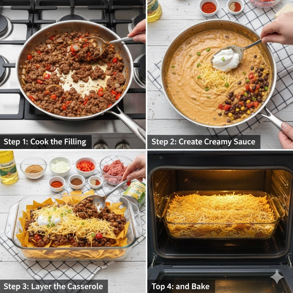 The creamy binder is what holds the casserole together and infuses moisture into the chips. When stirring in the cream of mushroom or cream of chicken soup, sour cream, and milk, ensure the mixture is completely homogeneous. Lumps of sour cream will not dissipate in the oven and will result in pockets of uneven texture. The heat from the meat base will help temper the dairy, making it easier to mix smoothly.