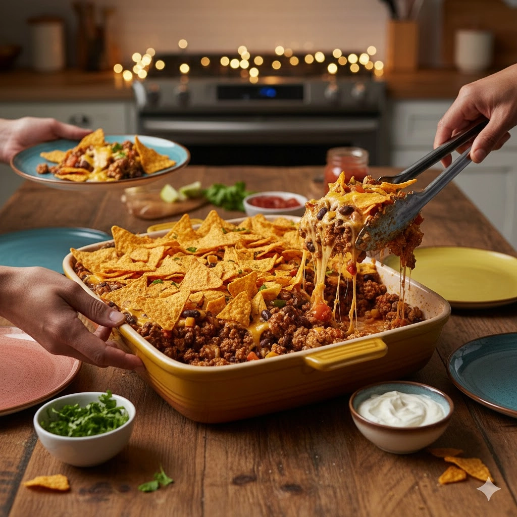 - Sprinkle the second third of the crushed Doritos over the cheese. Layer the remaining meat filling over this. Finish by topping with the final third of the Doritos and the remaining cheese. Bake for twenty-five to thirty-five minutes until the cheese is melted and bubbling at the edges and the internal temperature is one hundred sixty-five Fahrenheit. Rest for ten minutes before serving.