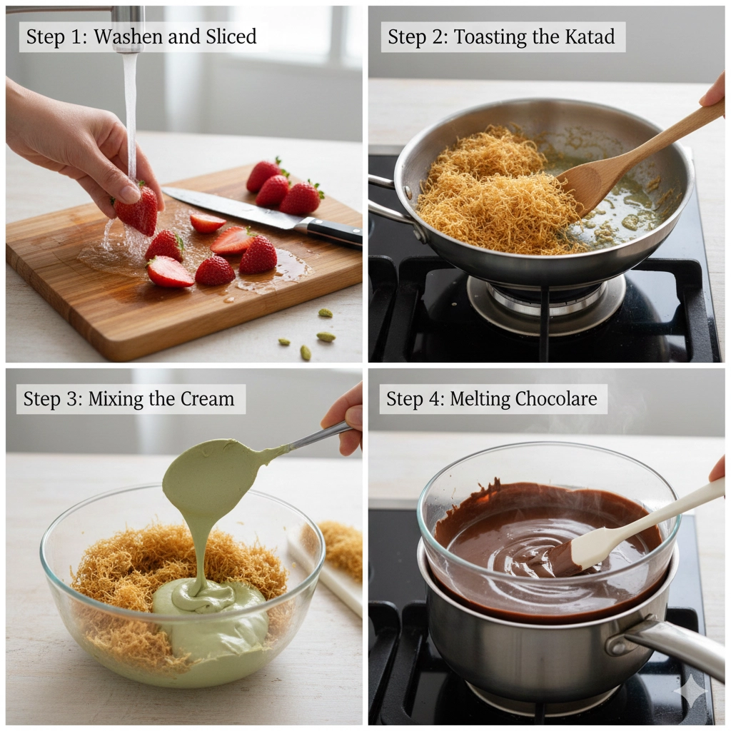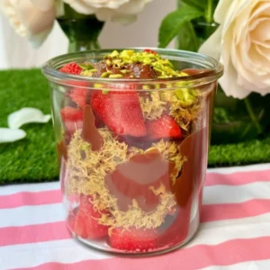 - Assemble the cups. Take four medium-sized glasses. Begin by adding a layer of strawberries to the bottom. Follow this with a layer of the pistachio kataifi mixture, then drizzle with the melted milk chocolate. Repeat these layers once more until the glasses are full.