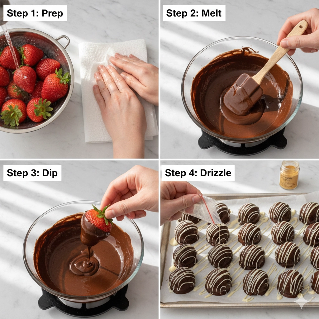 - Begin by preparing your fruit. Rinse 1 pint of fresh strawberries under cool running water, being careful not to bruise the delicate skins. Immediately and gently pat them dry using a clean kitchen towel or paper towels. It is vital that the strawberries are completely dry before you begin dipping; spread them out and allow them to air-dry further if any moisture remains.
