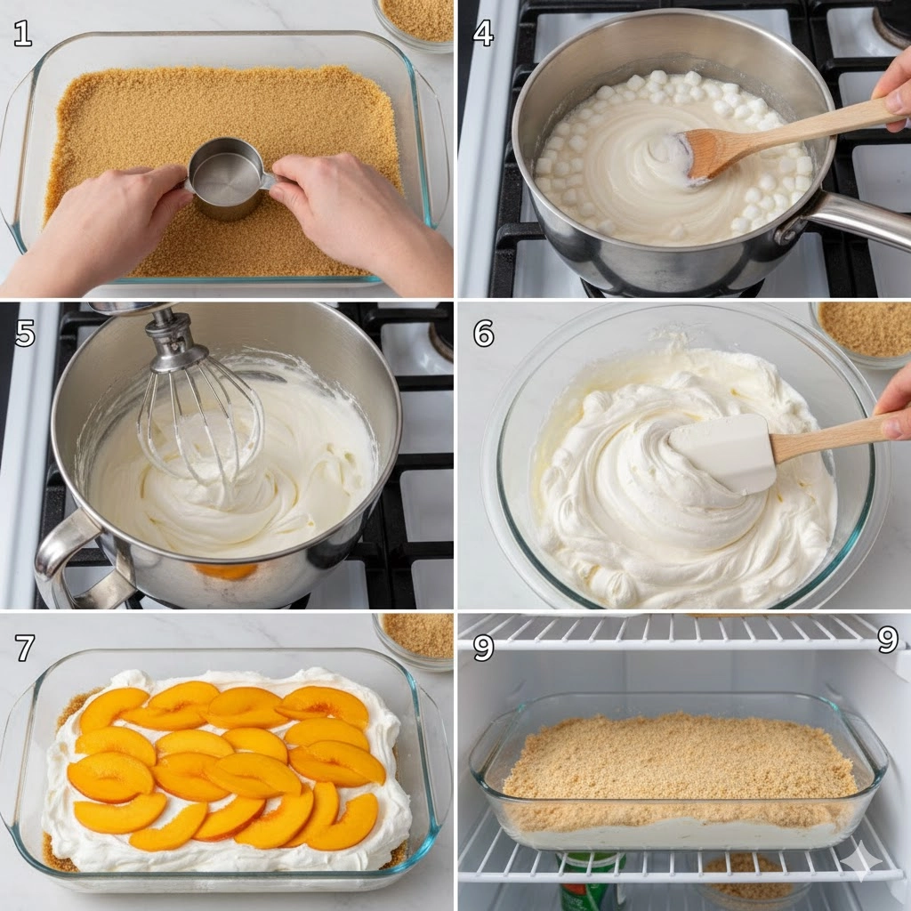 - Arrange the Fruit: Place the sliced peaches in an even layer across the cream. Cover them completely with the remaining marshmallow mixture.