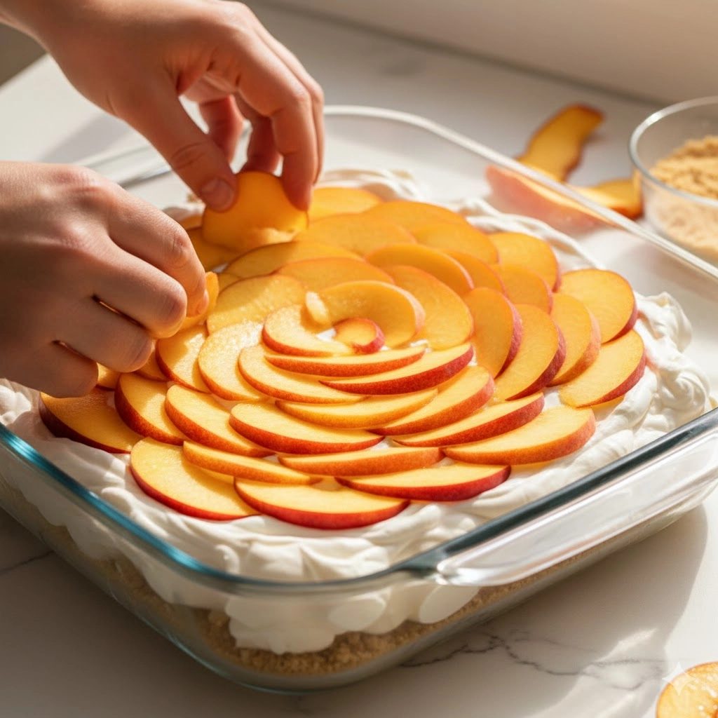 Peel your peaches by either using a sharp serrated peeler or the blanching method (dropping them in boiling water for thirty seconds, then an ice bath). Slice them to a uniform thickness of about one-quarter inch. When layering, try to keep the peaches in a single, slightly overlapping layer to ensure every bite has an equal distribution of fruit and cream.