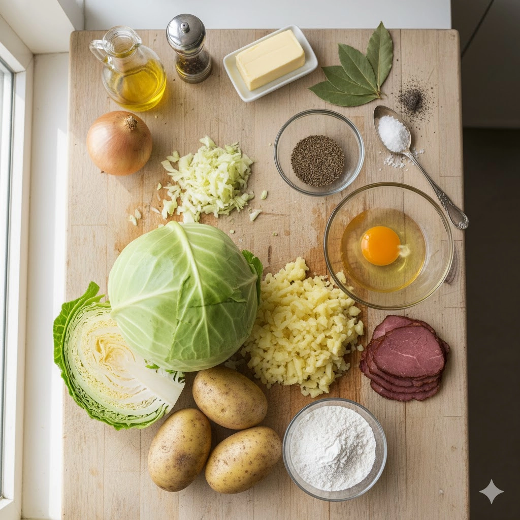 The most essential spices are salt, pepper, and caraway seeds. Caraway is traditional in German cabbage dishes and provides a warm, slightly peppery, anise-like flavor that complements the sweetness of the cabbage. Nutmeg is also commonly used in the dumpling dough.
