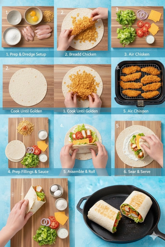 Gluten-Free Crusting: Replace the all-purpose flour with a high-quality gluten-free flour blend. For the cornflake portion, ensure you use a brand certified as gluten-free, or substitute them entirely with crushed potato chips (kettle-style for extra texture) or an equal amount of panko breadcrumbs made from rice flour. The high starch content in these substitutes still ensures a remarkable crunch for your Healthy Crispy Chicken Wrap.