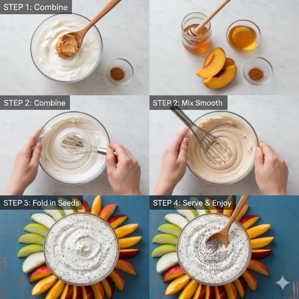 The cinnamon, while used in a small amount (only one-eighth of a teaspoon), is the “bridge” ingredient. It connects the floral notes of the honey with the roasted depth of the peanut butter. If you want a more aromatic experience, ensure your cinnamon is fresh; ground spices lose their potency after six months. Furthermore, if you are using the optional chia seeds, remember that they act as a thickening agent. Chia seeds absorb liquid and expand, creating a slight “pop” in every bite. If you prefer a completely silky dip, you might choose to leave them out or replace them with a sprinkle of hemp hearts for a similar nutritional boost without the gel-like texture.