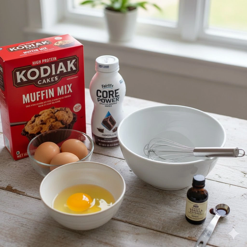 - In a medium bowl, combine the chocolate protein drink, muffin mix, room temperature eggs, and vanilla extract.