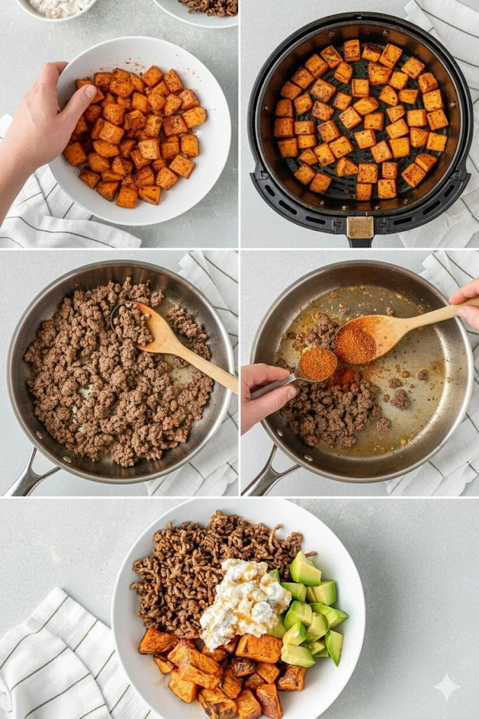 The secret to this dish lies in the textures. When preparing the sweet potatoes, aim for a “shattered” exterior and a creamy interior. If using an air fryer, don’t overcrowd the basket; air must circulate around each cube to create that signature roasted skin. If you notice the potatoes looking dry halfway through, a quick additional spray of oil can help the caramelization process.