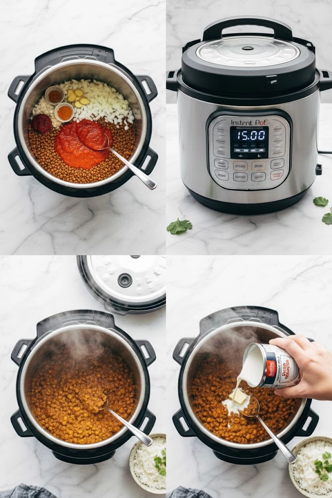 When adding the initial ingredients, focus on the layering to ensure even cooking. Some users find that pouring the tomato sauce on top of the other ingredients without aggressive stirring can help prevent the “burn” warning, as the sauce is thick and contains sugars that can stick to the bottom. Ensure the ginger and garlic are finely minced so they melt into the sauce during the high-pressure phase.
