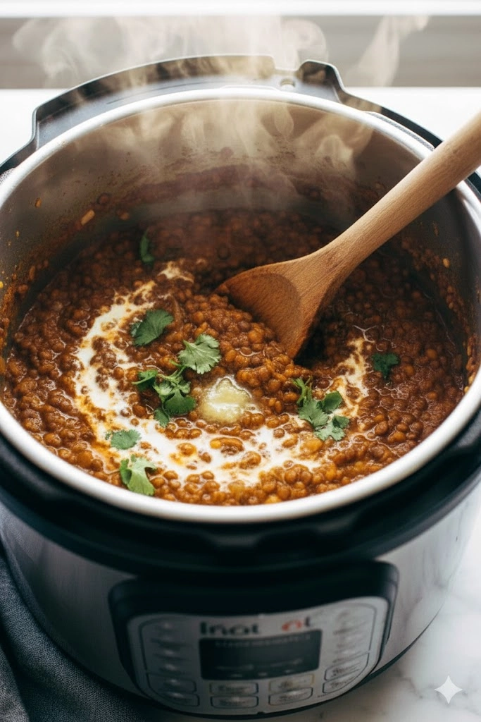 The final addition of coconut milk and butter is what creates the signature “restaurant-style” texture. The lentils should be tender but still hold their shape. If you prefer a thinner consistency, you can stir in a splash more water or coconut milk. The residual heat of the lentils is sufficient to melt the butter or ghee instantly.