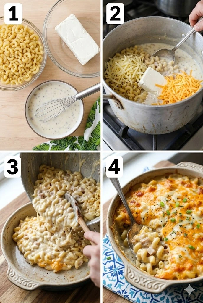 The integration of the room-temperature cream cheese is perhaps the most important detail for the texture of the sauce. If the cream cheese is too cold, it will remain in small clumps rather than melting into a cohesive velvet. By stirring it into the hot pasta and ham along with the milk and soup, you create an emulsion. The fats from the cream cheese and the shredded cheddar bind with the liquid from the milk, ensuring that every single curve of the macaroni is filled with sauce.