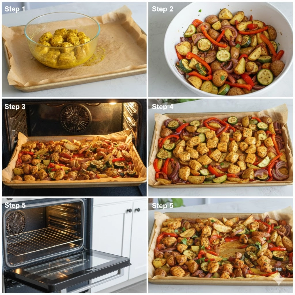 This sequence is designed to ensure all components finish cooking at the same moment, maximizing texture and safety. Pre-roasting the dense vegetables is the essential step for avoiding undercooked potatoes or overcooked, dry chicken.