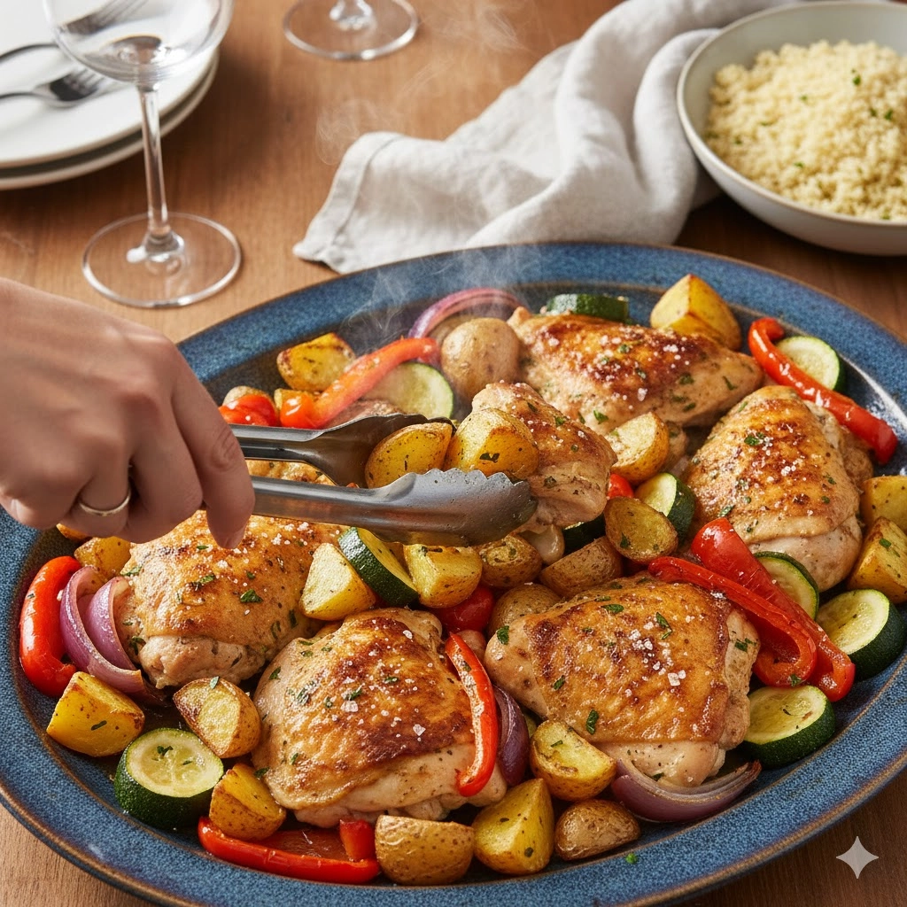 - Return to oven and roast for 15–20 minutes, or until chicken reaches 165°F and potatoes are tender.