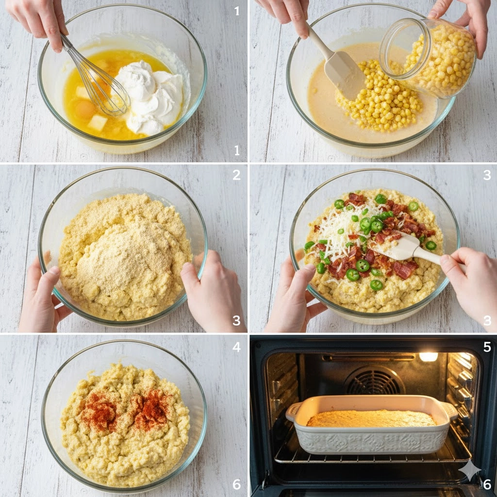 Fold in your savory additions using a wide rubber spatula. The bacon should be rendered until very crisp; if it is chewy, it will get lost in the moisture of the corn. When dicing the jalapenos, aim for a fine mince so the heat is distributed evenly rather than delivering one intense spicy bite. The sharp cheddar provides better oil release and flavor than mild versions, creating those signature pockets of melted cheese that brown beautifully against the yellow corn.