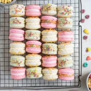 Baking macarons is as much a science experiment as it is a culinary art. These Lucky Charms Cereal Macarons take that challenge and turn it into something purely joyful. They represent the perfect balance of technical skill and childhood nostalgia. While the process requires patience—from the double-sifting of the flour to the overnight maturation in the fridge—the reward is a dessert that sparks conversation and brings a smile to everyone who tries one. So, put on your favorite apron, turn on some music, and enjoy the process of creating these tiny, magical pieces of pastry art.