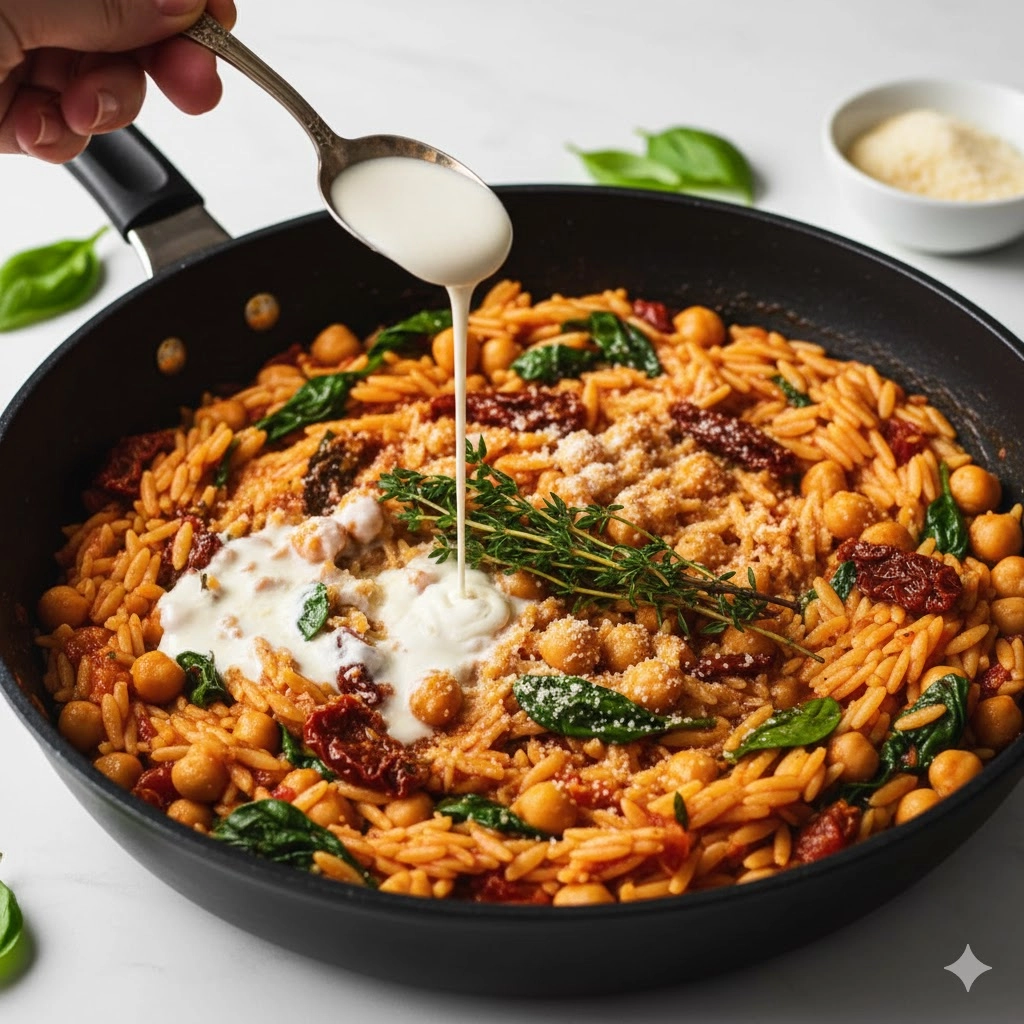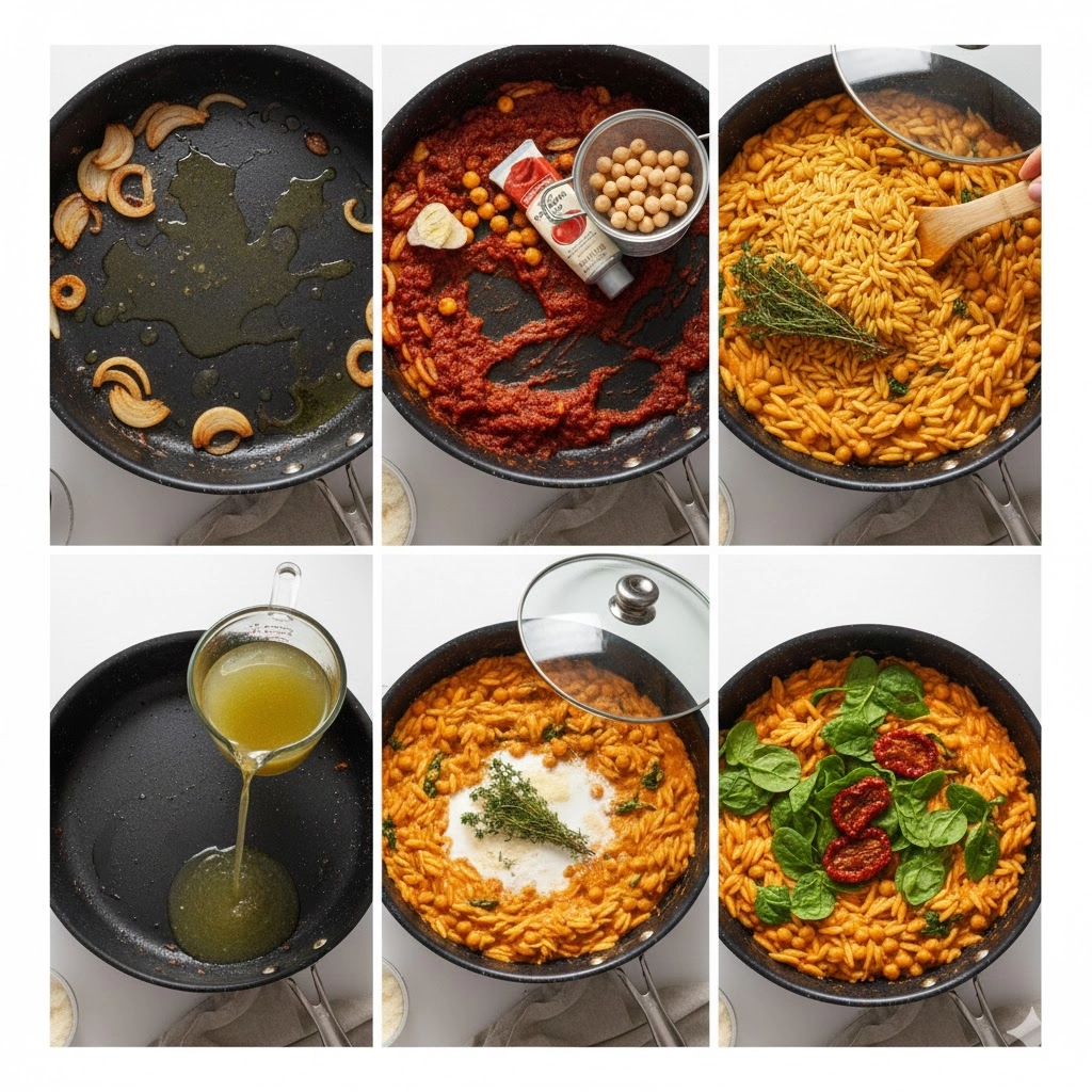 - Introduce the Orzo: Pour in the dry orzo and stir to coat all the grains thoroughly in the tomato-chickpea mixture. Cook for one minute, lightly toasting the pasta.