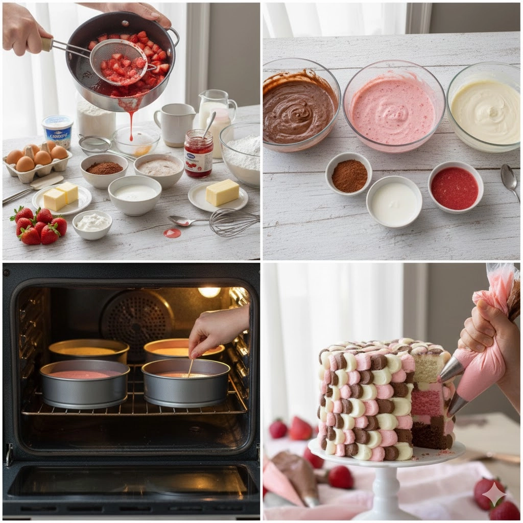Divide the base batter equally into three separate bowls. To the first bowl, add 2 tablespoons of cocoa powder and stir until the batter is a rich chocolate brown. To the second bowl, add three quarters of your prepared strawberry reduction, mixing until the batter is fragrant and pink. Leave the third bowl as is for your classic vanilla layer.