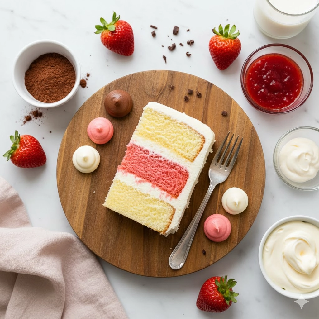There is a certain nostalgic magic associated with the trio of chocolate, vanilla, and strawberry. Most of us grew up with those classic rectangular tubs of tricolor ice cream, where the hardest part of dessert was deciding which stripe to scoop first. This Neapolitan Cake takes that beloved childhood memory and transforms it into a sophisticated, show-stopping centerpiece. By utilizing a single, high-quality base batter divided and flavored three ways, we create a dessert that offers something for everyone. Whether you are a chocoholic, a fruit lover, or a vanilla purist, this cake delivers a harmonious symphony of flavors in every bite. It is a labor of love that rewards the baker with beautiful layers and an even more impressive cross-section.