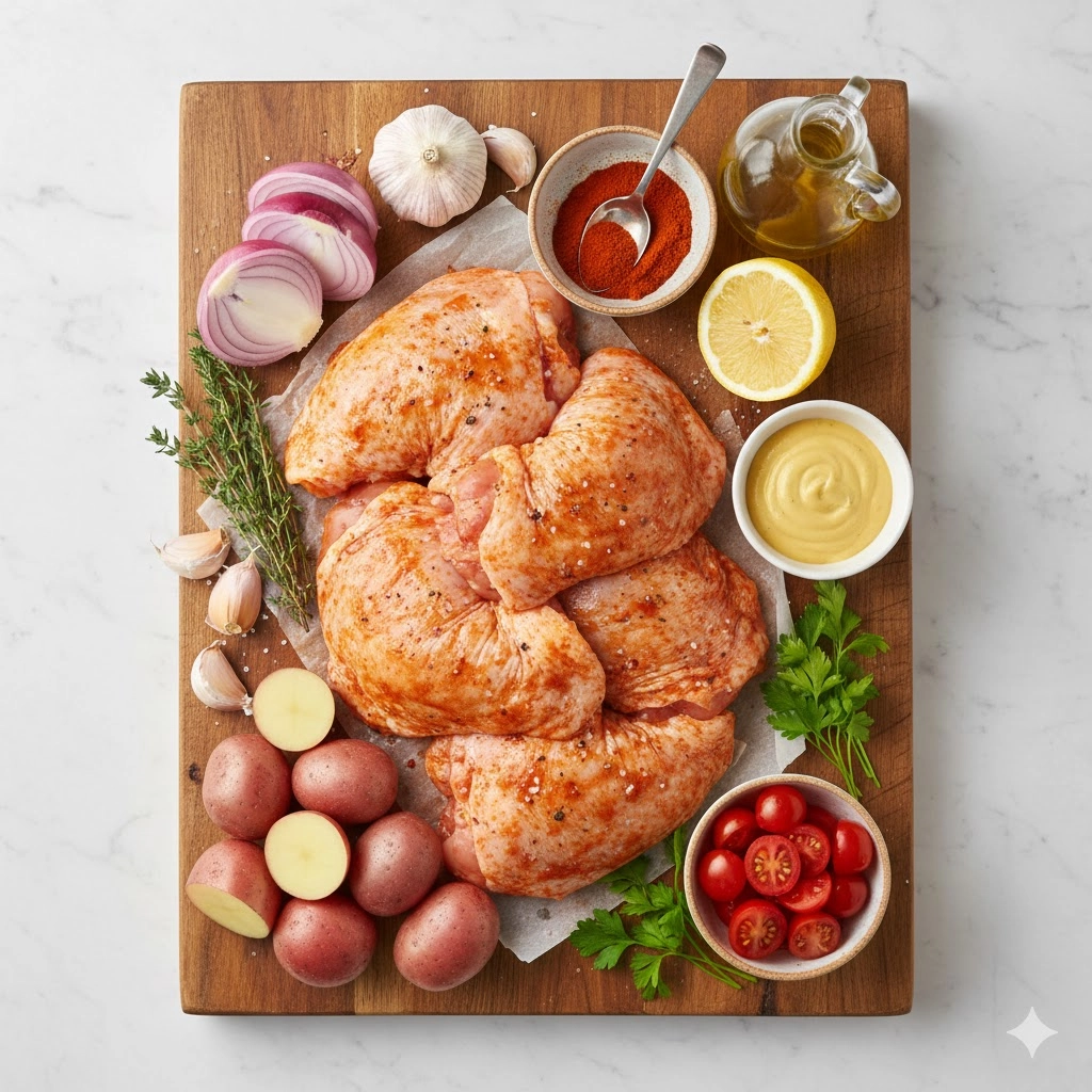 If you are concerned about the fat content, trimming the excess skin as instructed in the steps is the best way to manage it. You want enough skin to cover the top of the thigh to keep it moist, but you don’t need the large flaps of skin that often hang off the sides. By removing that excess, you ensure the pan doesn’t become overly greasy, leaving you with just the right amount of flavorful oil to crisp up the potatoes.
