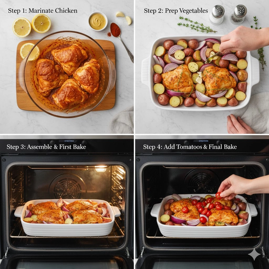 - Add the Tomatoes: Carefully remove the pan from the oven. Scatter the halved cherry tomatoes over the chicken and potatoes.