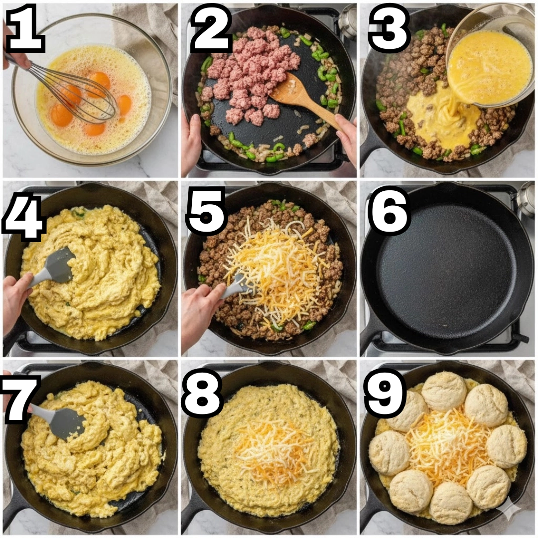 The key is the stovetop step. By partially cooking the eggs until they are set but moist, you create a stable “shelf” for the biscuits to sit on. This prevents the dough from sinking into raw liquid, allowing the heat to penetrate the bottom of the biscuit effectively.